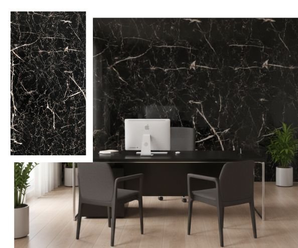 Este diseño aporta carácter y sofisticación al espacio de trabajo, combinando la profundidad del mármol oscuro con vetas naturales que añaden dinamismo visual. Su acabado elegante realza la pared principal sin sobrecargar el ambiente, creando un entorno profesional, moderno y visualmente equilibrado. Ideal para oficinas que buscan distinción y presencia.